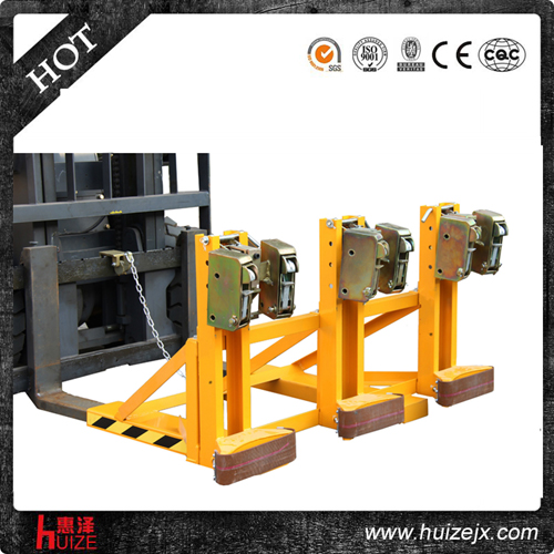 重型三油桶夾具單鷹嘴純機(jī)械機(jī)構(gòu)設(shè)計(jì)可與叉車方便地配合,僅依靠叉車的動(dòng)作,不需要其它的動(dòng)力,可自動(dòng)一次搬運(yùn)3個(gè)塑料油桶, 配置可拆換式柔性耐磨保護(hù)墊,有效保護(hù)油桶并緩沖叉車行駛過(guò)程中的震動(dòng), 能在集裝箱等這樣狹小的環(huán)境內(nèi)裝卸桶裝物質(zhì),可極大地提高空間利用率, 與貨叉連接配有自鎖裝置確保油桶夾在坡度上和顛簸路面使用時(shí)不會(huì)滑落.